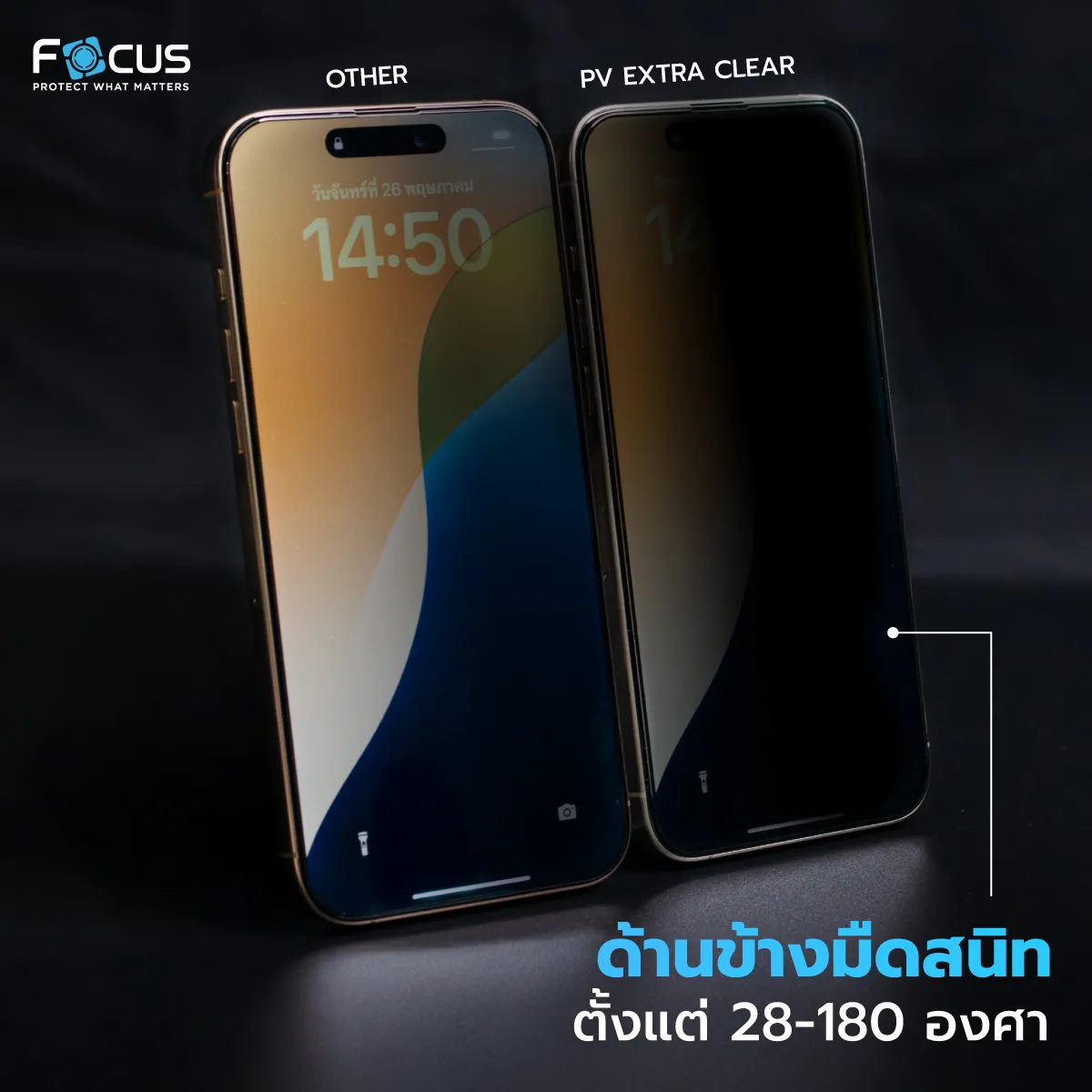 ฟิล์มกระจกกันมอง โฟกัส (FOCUS PRIVACY GLASS) เป็นอีกหนึ่งตัวเลือกที่ยอดเยี่ยม สำหรับผู้ที่ต้องการปกป้องความเป็นส่วนตัวบนหน้าจอสมาร์ตโฟน ด้วยคุณสมบัติที่ครบครันทั้งการป้องกันการแอบมอง ความคมชัดของหน้าจอ ความแข็งแรงทนทาน และการสัมผัสที่ลื่นไหล ทำให้คุณสามารถใช้งานสมาร์ตโฟน ได้อย่างสบายใจในทุกสถานการณ์ ให้ทุกเรื่องส่วนตัวบนหน้าจอ เป็นของคุณแค่คนเดียว เลือกใช้ ฟิล์มกันมอง หรือ ฟิล์มกันเผือก จากโฟกัส เพื่อประสบการณ์การใช้งานที่ดีที่สุด